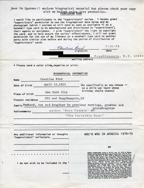 In CopyrightCaroline Bird filled out this permission letter for participation in the first supersisters trading card series.