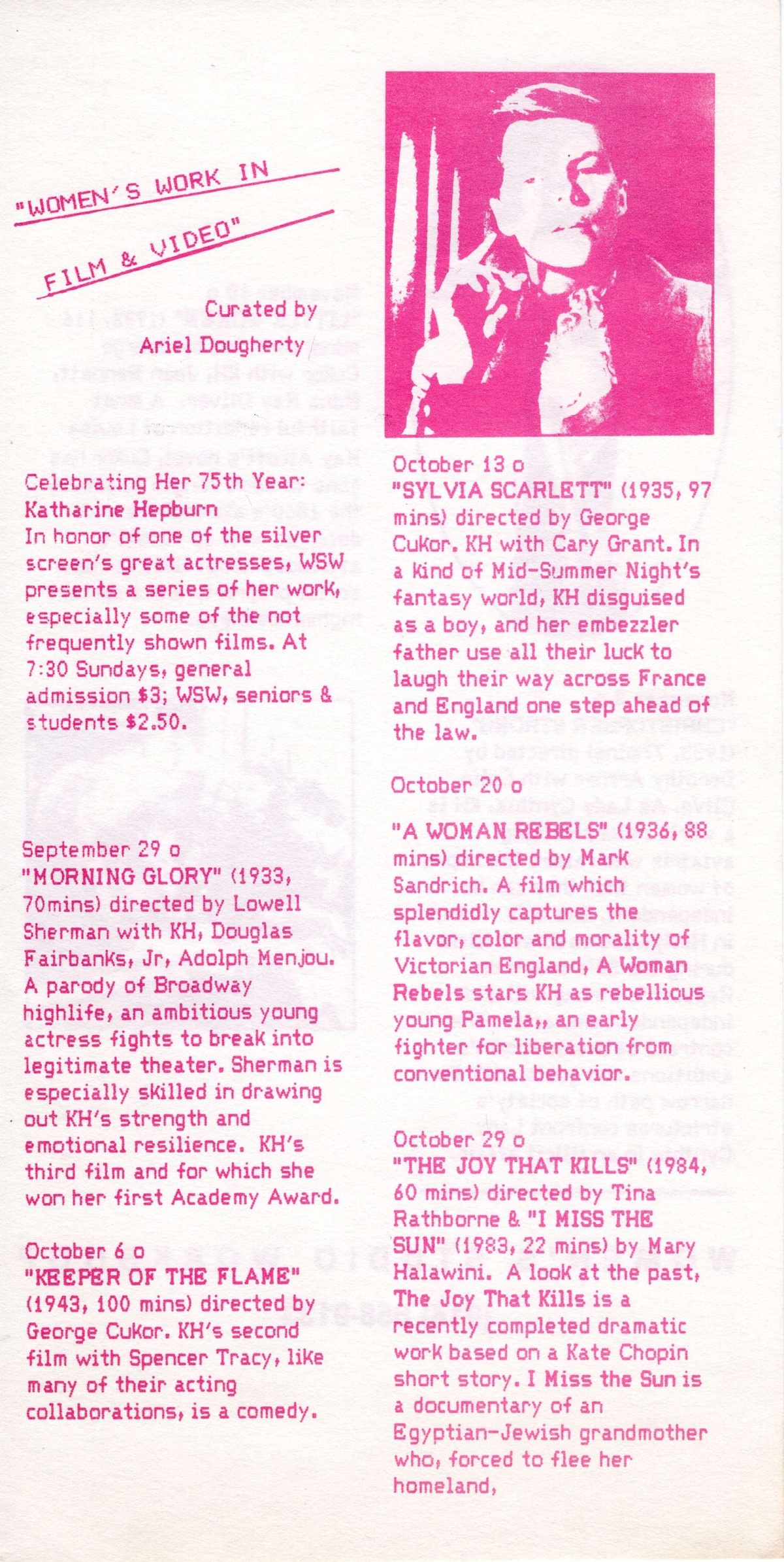 "Women's Work in Film & Video, Fall 1985" screening flyer