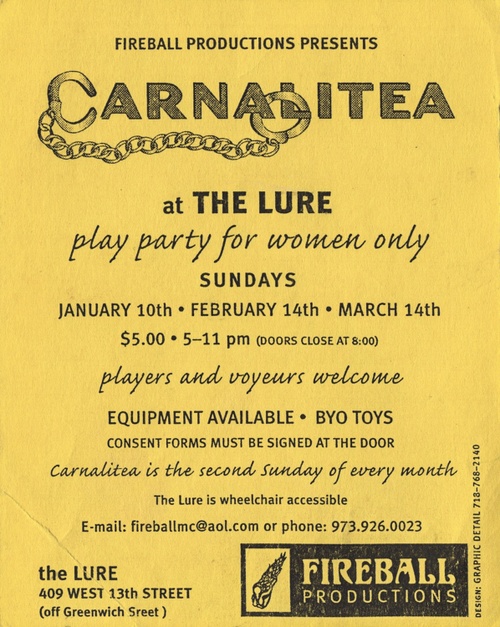 This scan shows a flyer for Carnalitea, a play party for women at The Lure in NYC.