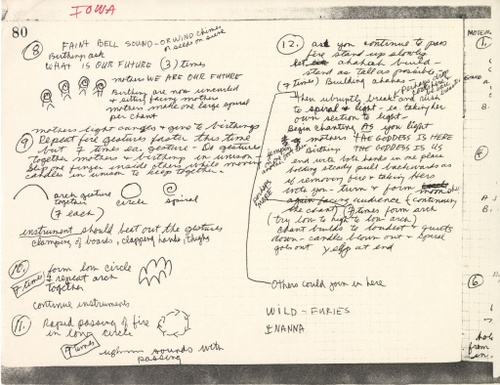 This scan shows Mary Beth Edelson’s planning and brainstorming for her 1978 installation, earthwork and ritual performance, Fire Flights In Deep Space, which was shown at The University of Iowa.