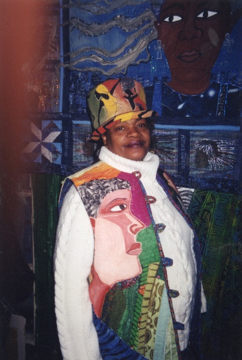 Dindga McCannon is pictured in front of one of her artworks wearing her quilted vest. The piece is about appreciating the lives and struggles of the women that surrounded McCannon.