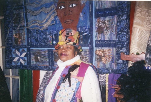 In Copyright - Educational Use PermittedDindga McCannon is photographed in front of one of her artworks wearing her quilted vest. The piece is about appreciating the lives and struggles of the women that surrounded McCannon.