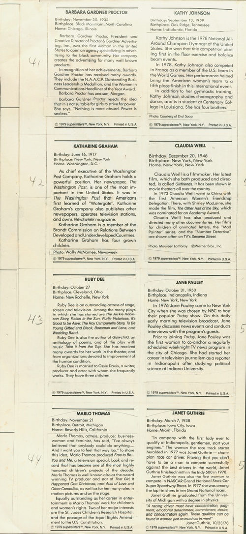 This is a partial supersisters poster proof that features the biographies of Barbara Gardner Proctor, Katharine Graham, Ruby Dee, Marlo Thomas, Kathy Johnson, Claudia Weill, Jane Pauley, and Janet Guthrie. All supersisters cards were printed as posters and cut to order.